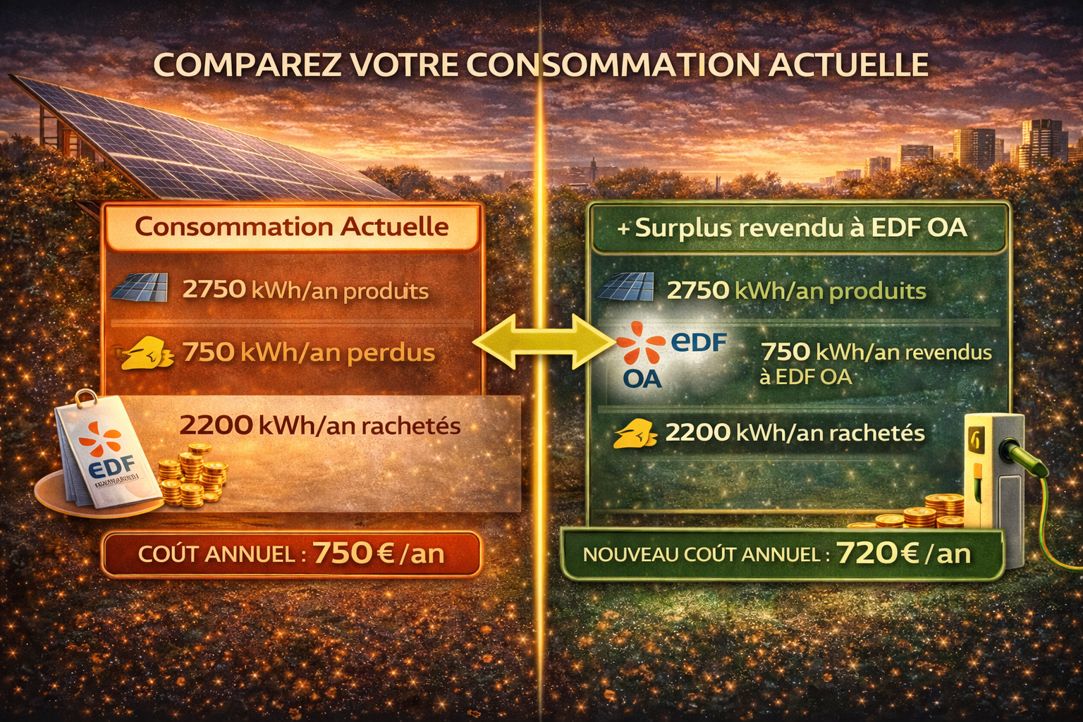 750 kWh × 0,20 € = 150 € (économie en autoconsommation)