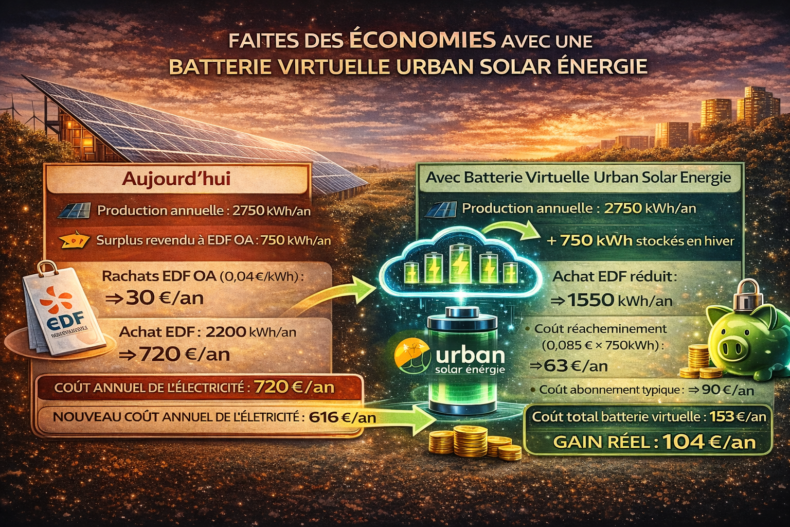 Si ce surplus de 750 kWh est stocké via l’offre de stockage virtuel Urban Solar Energy, le principe est le suivant : l’électricité injectée dans le réseau n’est plus simplement perdue ou revendue à bas prix, elle peut être récupérée plus tard pour réduire les achats d’électricité du foyer.